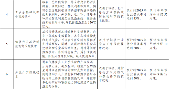 《目錄》涉及工業節能技術、信息化領域節能技術、高效節能裝備三個方麵。其中,工業節能技術中的鋼鐵行業節能提效技術共14項,具體情況如下——