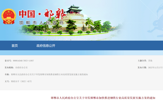 11月17日,邯鄲市人民政府網站發布了關於印發邯鄲市加快推進鋼鐵行業高質量發展實施方案(以下簡稱方案)的通知。