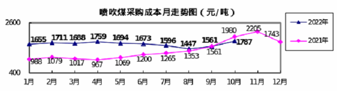 噴吹煤10月份加權平均折算成幹基的采購成本為1786.70元/噸,環比升高225.87元/噸,升幅為14.47%。1-10月累計平均折算成幹基的采購成本為1643.91元/噸,同比升高407.97元/噸,升幅為33.01%。