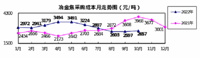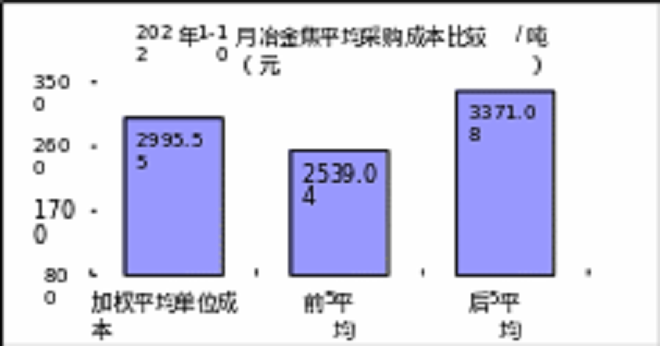 冶金焦10月份加權平均折算成幹基的采購成本2657.32元/噸,環比升高60.48元/噸,升幅為2.33%。1-10月累計平均折算成幹基的采購成本為2995.55元/噸,同比升高210.10元/噸,升幅為7.54%。