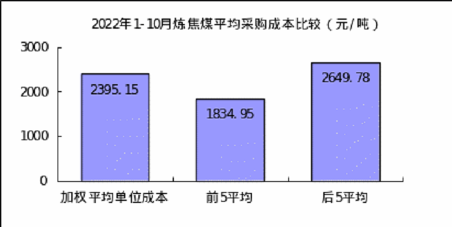 1-10月對標企業煉焦煤平均采購成本最低的前5家企業折算成幹基的加權平均采購成本為1834.95元/噸,比對標企業平均采購成本低560.20元/噸,低於平均采購成本23.39%;而采購成本最高的5家企業的加權平均采購成本為2649.78元/噸,比對標企業平均采購成本高254.63元/噸,高於平均采購成本10.63%。