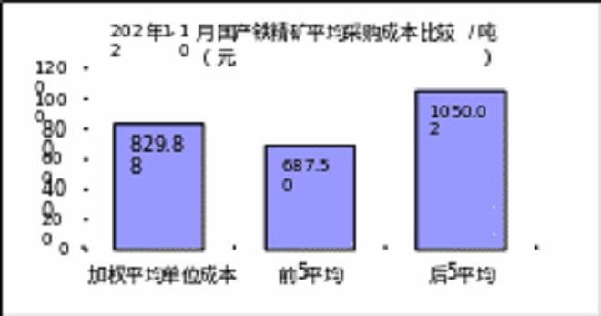1-10月對標企業進口粉礦折算成62%品位的平均采購成本為878.52元/噸,成本最低的前5家企業的加權平均采購成本為770.58元/噸,比對標企業平均采購成本低107.94元/噸,低於平均采購成本12.29%;而采購成本最高的5家企業加權平均采購成本為1043.32元/噸,比對標企業平均采購成本高164.80元/噸,高於平均采購成本18.76%。