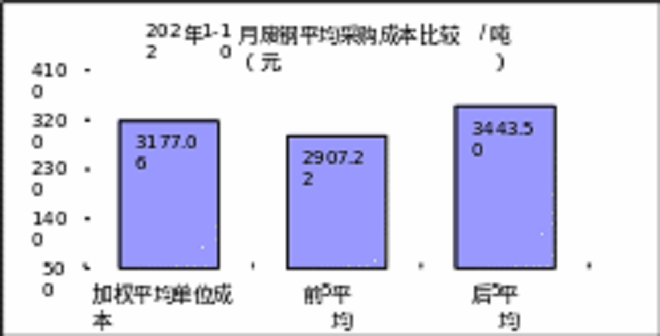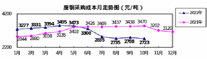 廢鋼10月份加權平均采購成本為2722.85元/噸,環比下降65.32元/噸,降幅為2.34%。1-10月累計平均采購成本為3177.06元/噸,同比下降75.75元/噸,降幅為2.33%。