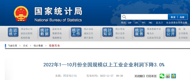 國家統計局發布數據,1—10月份,全國規模以上工業企業實現利潤總額69768.2億元,同比下降3.0%(按可比口徑計算)。