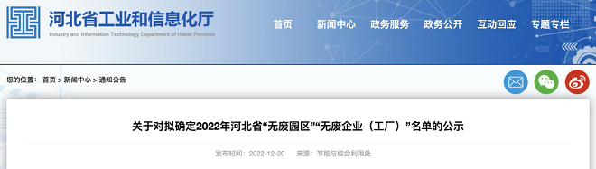 12月20日,河北省工信廳網站發布了《關於對擬確定2022年河北省“無廢園區”“無廢企業(工廠)”名單的公示》(以下簡稱《公示》)。