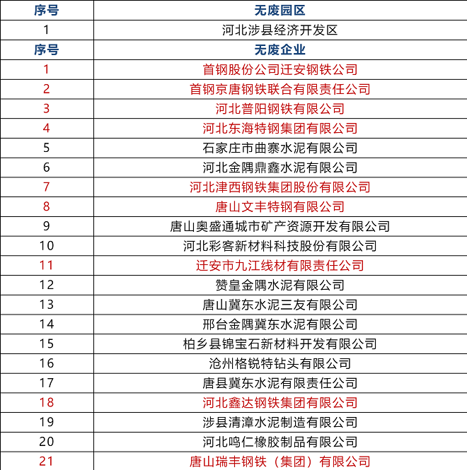 河北省公示21家“無廢企業”:首鋼遷鋼、首鋼京唐、普陽鋼鐵、東海特鋼、津西、文豐特鋼、九江線材、鑫達、瑞豐鋼鐵等上榜