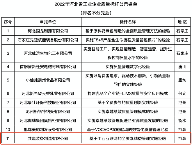 共贏裝備製造有限公司進入2022年河北省工業企業質量標杆公示名單