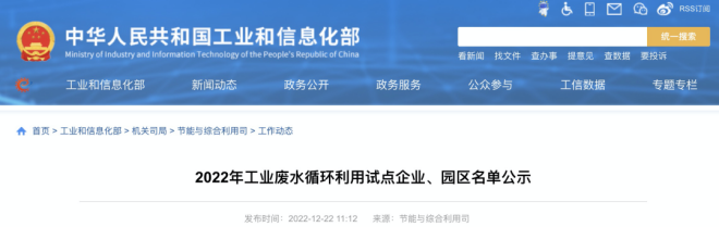 近日,中華人民共和國工業和信息化部網站發布了《2022年工業廢水循環利用試點企業、園區名單公示》(以下簡稱《公示》)。