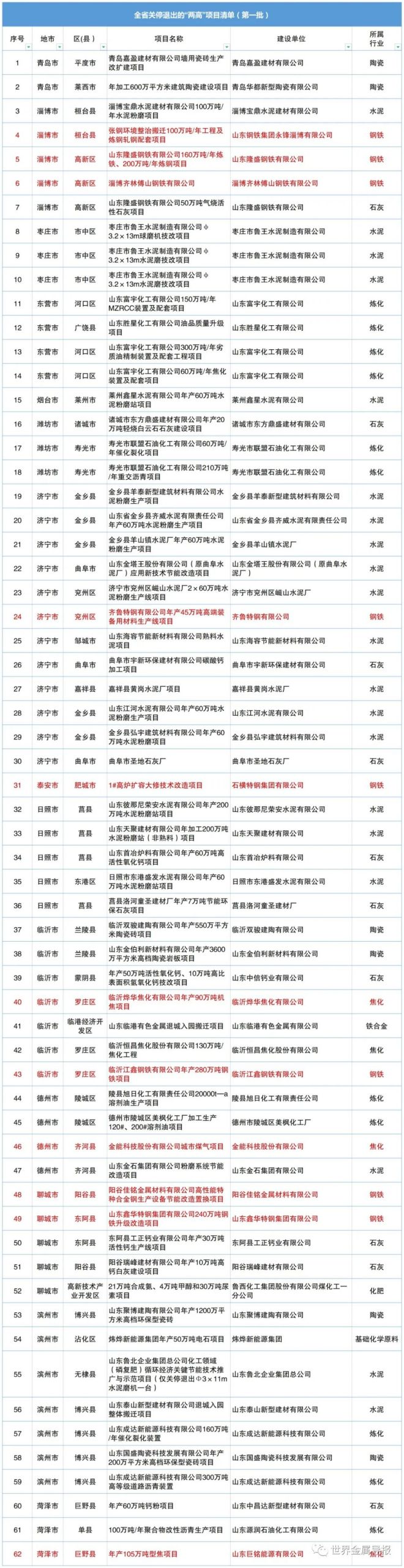 依據《山東省人民政府辦公廳關於印發堅決遏製“兩高”項目盲目發展的若幹措施的通知》(魯政辦字〔2021〕98號)有關規定,經過省市縣三級聯合審查,並經企業確認,山東省發展和改革委員會對第一批可以繼續保留實施的“兩高”項目和關停退出的“兩高”項目進行公示,其中,11個鋼鐵項目涉及“兩高”或被關停退出。