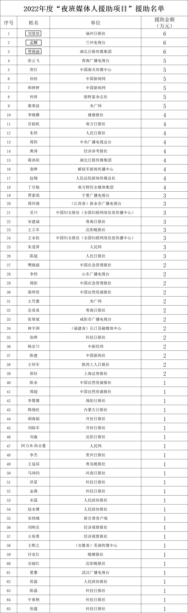 通過率高達92.9%,共發放援助金160萬元。2023年1月7日,在中國經濟媒體融合發展高峰論壇上,2022年度“夜班媒體人援助項目”名單正式公布,共計65位申請者獲得援助。截至目前,除個別援助對象需補充流程文件,其他援助對象的援助金均已到賬。