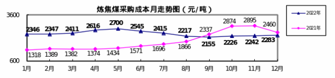 對標企業煉焦煤12月份加權平均折算成幹基的采購成本為2282.61元/噸,環比升高40.83元/噸,升幅為1.82%。1—12月累計平均折算成幹基的采購成本為2374.19元/噸,同比升高473.43元/噸,升幅為24.91%。