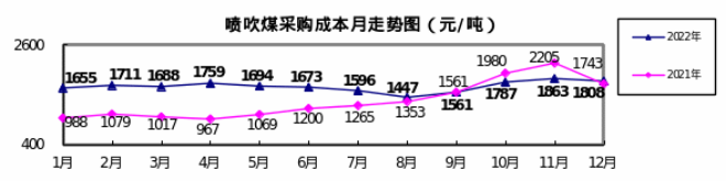 噴吹煤12月份加權平均折算成幹基的采購成本為1808.31元/噸,環比下降54.28元/噸,降幅為2.91%。1—12月累計平均折算成幹基的采購成本為1675.91元/噸,同比升高327.72元/噸,升幅為24.31%。