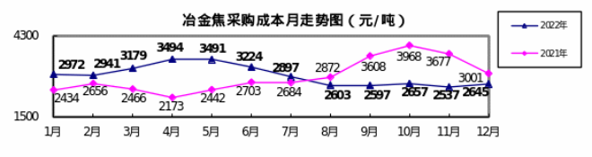 冶金焦12月份加權平均折算成幹基的采購成本2644.73元/噸,環比升高107.58元/噸,升幅為4.24%。1—12月累計平均折算成幹基的采購成本為2924.57元/噸,同比升高62.60元/噸,升幅為2.19%。