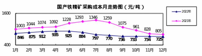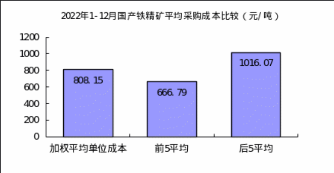 1—12月對標企業國產鐵精礦折算成62%品位的平均采購成本為808.15元/噸,成本最低的前5家企業的加權平均采購成本為666.79元/噸,比對標企業平均采購成本低141.36元/噸,低於平均采購成本17.49%;而采購成本最高的5家企業的加權平均采購成本為1016.07元/噸,比對標企業平均采購成本高207.92元/噸,高於平均采購成本25.73%。