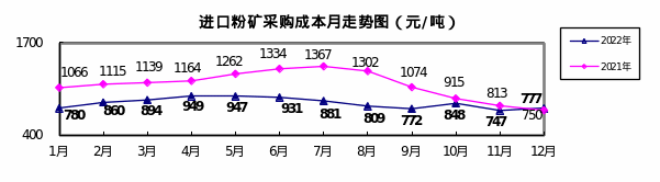 1—12月對標企業進口粉礦折算成62%品位的平均采購成本為856.31元/噸,成本最低的前5家企業的加權平均采購成本為764.24元/噸,比對標企業平均采購成本低92.07元/噸,低於平均采購成本10.75%;而采購成本最高的5家企業加權平均采購成本為1001.27元/噸,比對標企業平均采購成本高144.96元/噸,高於平均采購成本16.93%。