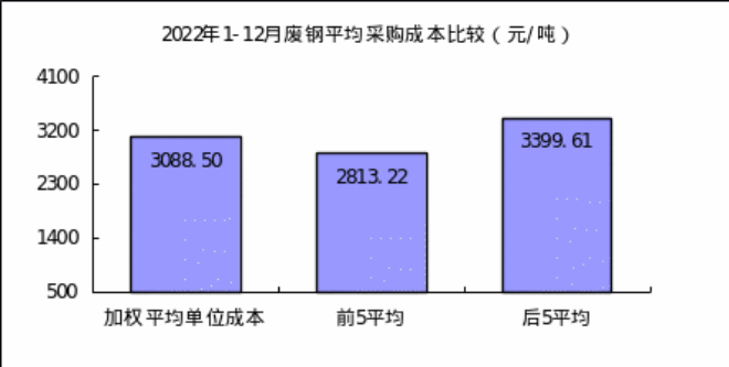 1—12月對標企業廢鋼平均采購成本最低的前5家企業的加權平均采購成本為2813.22元/噸,比對標企業平均采購成本低275.28元/噸,低於平均采購成本8.91%;而采購成本最高的5家企業加權平均采購成本為3399.61元/噸,比對標企業平均采購成本高311.11元/噸,高於平均采購成本10.07%。