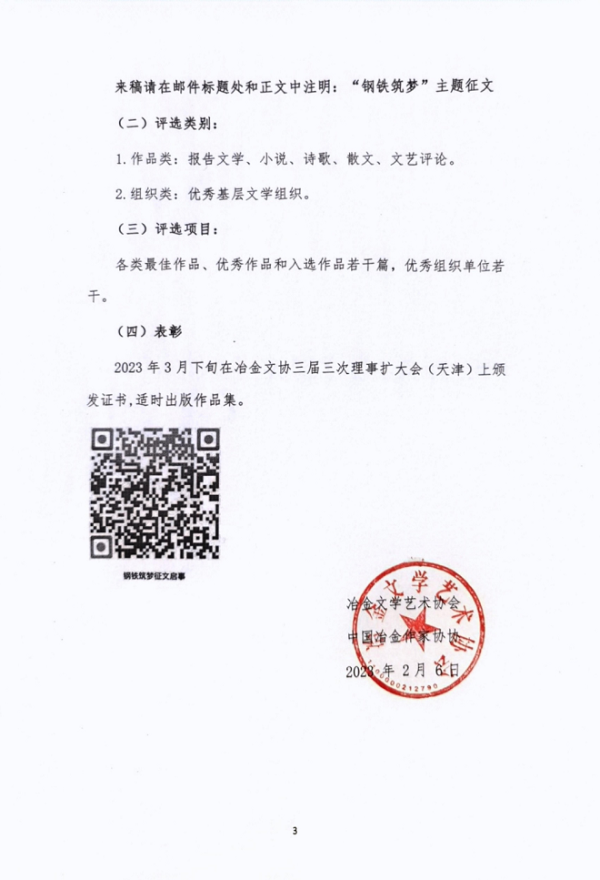 3年來(2019年1月~2023年2月),全國冶金企業職工創作的冶金(鋼鐵)文學作品,社會作者書寫的冶金(鋼鐵)內容的文學作品,包括報告文學、小說、詩歌、散文、文學評論等。