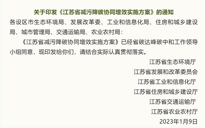 近日,江蘇省生態環境廳網站發布了《江蘇省減汙降碳協同增效實施方案》(以下簡稱《方案》)。