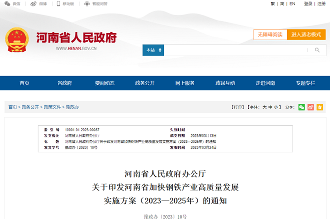 近日,河南省人民政府網站發布了《河南省人民政府辦公廳關於印發河南省加快鋼鐵產業高質量發展實施方案(2023—2025年)的通知》(以下簡稱《通知》)。