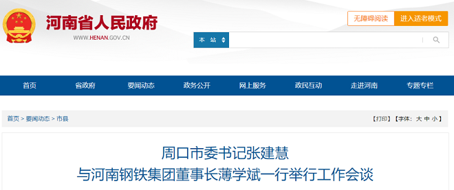 近日,從河南省人民政府網站獲悉,4月7日,周口市委書記張建慧與河南鋼鐵集團黨委書記、董事長薄學斌一行舉行工作會談。雙方就共同推動合作項目建設、深化戰略合作等進行深入交流,並達成廣泛共識。周口市市長吉建軍參加會談。