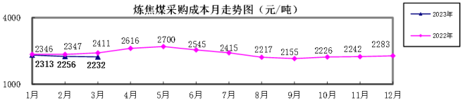 對標企業煉焦煤3月份加權平均折算成幹基的采購成本為2231.64元/噸,環比下降24.32元/噸,降幅為1.08%。1—3月累計平均折算成幹基的采購成本為2267.54元/噸,同比下降107.14元/噸,降幅為4.51%。