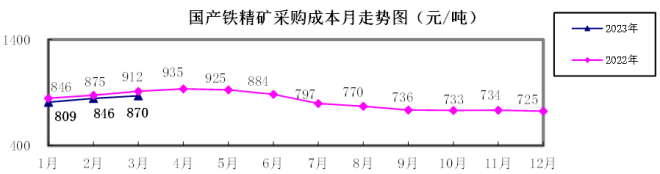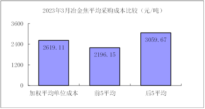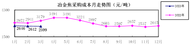 2023年1—3月,煉焦煤采購成本同比下降4.51%;冶金焦同比下降13.68%;國產鐵精礦同比下降3.86%,進口粉礦同比上升3.25%;廢鋼同比下降15.33%。