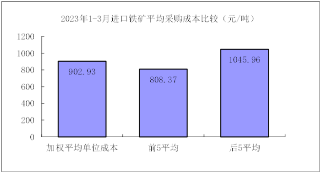1—3月對標企業進口粉礦折算成62%品位的平均采購成本為887.53元/噸,成本最低的前5家企業的加權平均采購成本為801.50元/噸,比對標企業平均采購成本低86.04元/噸,低於平均采購成本9.69%;而采購成本最高的5家企業加權平均采購成本為1034.47元/噸,比對標企業平均采購成本高146.94元/噸,高於平均采購成本16.56%。