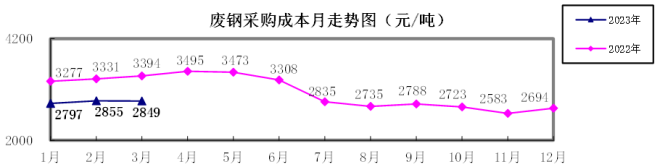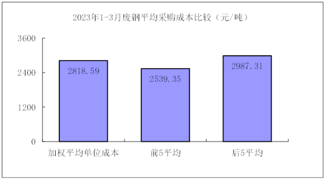 廢鋼3月份加權平均采購成本為2848.53元/噸,環比下降6.16元/噸,降幅為0.22%。1—3月累計平均采購成本為2818.59元/噸,同比下降510.34元/噸,降幅為15.33%。