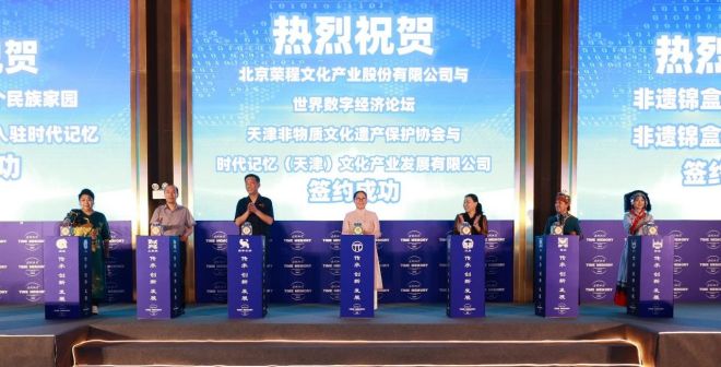 大會還舉行了簽約儀式,榮程文化健康集團分別與天津市非物質文化遺產保護協會、世界數字經濟論壇、15個民族匠人合作夥伴、非遺錦盒海內外銷售代理等簽約,並在現場舉行了百萬設計大賽第一季“老手藝 新設計”啟動儀式。