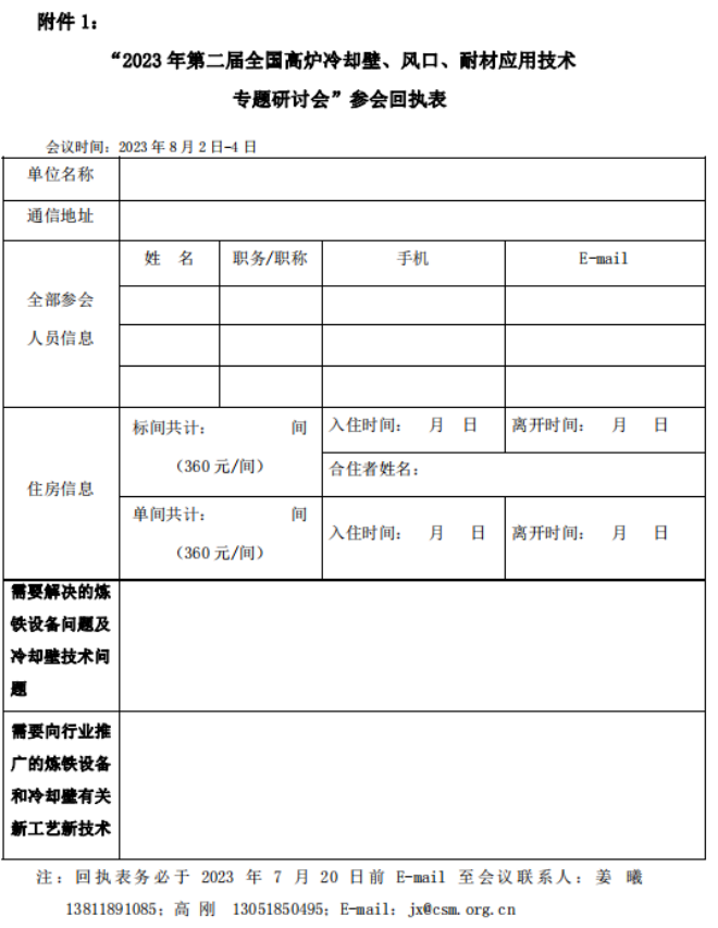 1.“2023年第二屆全國高爐冷卻壁、風口、耐材應用技術專題研討會”參會回執表