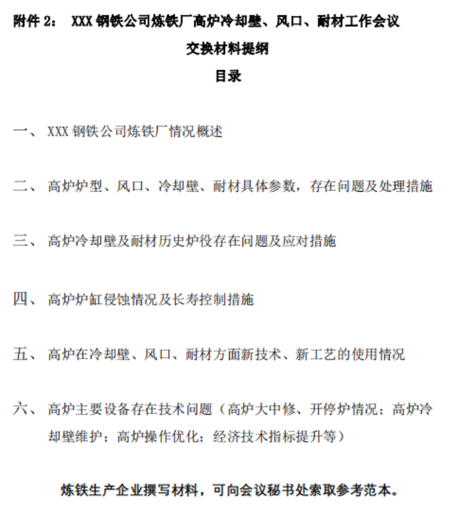2. XXX鋼鐵公司煉鐵廠高爐冷卻壁、風口、耐材工作會議專題研討交換材料提綱模板
