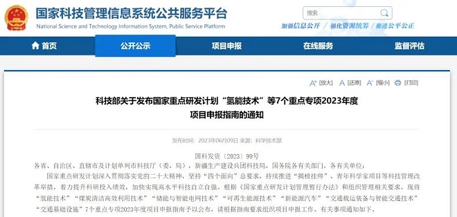 6月9日,科技部發布關於國家重點研發計劃“氫能技術”等7個重點專項2023年度項目申報指南的通知。