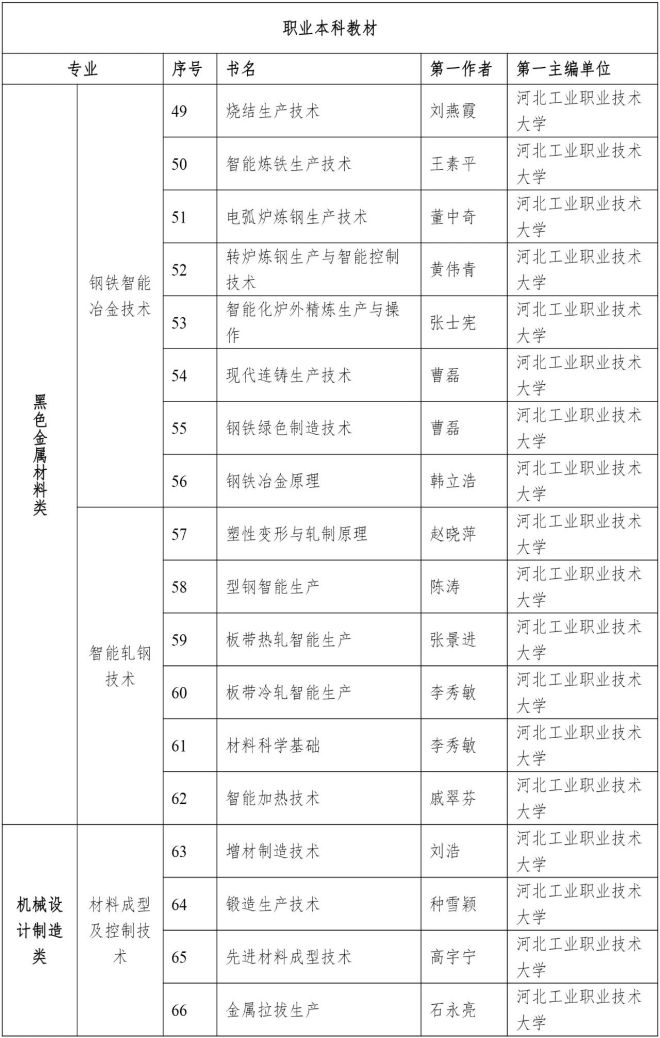 為打造精品冶金專業教材,切實提高教材建設水平,根據“冶金專業教材和工具書經典傳承國際傳播工程”(以下簡稱“經典工程”)工作安排,經單位申報、多輪評審、意見征詢、專家審定等環節,中國鋼鐵工業協會於近日公布了“經典工程”第一批立項教材書目,其中,高等教材 96 種(見附件1),職業教育教材 66 種(見附件2),具體工作由冶金工業出版社承擔。