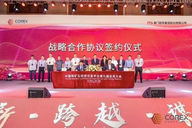 會議期間,北鐵中心與廈門國貿集團股份有限公司舉辦戰略合作協議簽約儀式。本次合作是北鐵中心開拓“大客戶專場”業務模式的重要舉措,雙方將通過平台專門板塊開展全方位合作。遊鬆和李鵬代表雙方簽署協議。王穎生、錢景汾、中國礦產資源集團鐵礦事業部資源平衡總監劉政群等共同見證簽約。