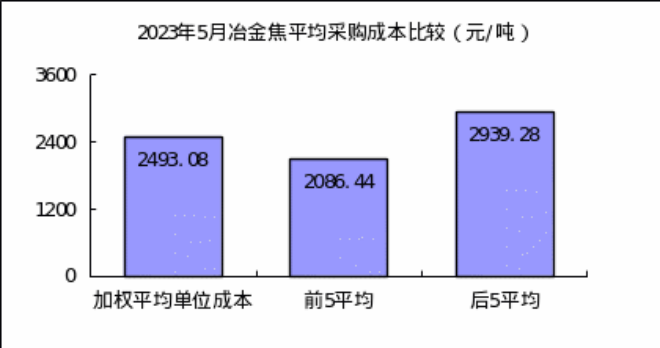 冶金焦5月份加權平均折算成幹基的采購成本2152.28元/噸,環比下降332.61元/噸,降幅為13.39%。1-5月累計平均折算成幹基的采購成本為2493.08元/噸,同比下降715.99元/噸,降幅為22.31%。
