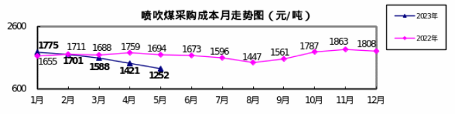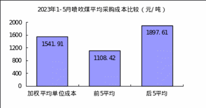 噴吹煤5月份加權平均折算成幹基的采購成本為1252.27元/噸,環比下降168.27元/噸,降幅為11.85%。1-5月累計平均折算成幹基的采購成本為1541.91元/噸,同比下降136.79元/噸,降幅為8.15%。
