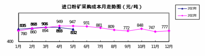 2023年1-5月,煉焦煤采購成本同比下降13.83%;冶金焦同比下降22.31%;國產鐵精礦同比下降6.76%,進口粉礦同比下降2.04 %;廢鋼同比下降18.82%。