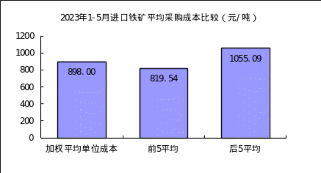 1-5月對標企業進口粉礦折算成62%品位的平均采購成本為884.51元/噸,成本最低的前5家企業的加權平均采購成本為815.31元/噸,比對標企業平均采購成本低69.20元/噸,低於平均采購成本7.82%;而采購成本最高的5家企業加權平均采購成本為1043.11元/噸,比對標企業平均采購成本高158.60元/噸,高於平均采購成本17.93%。