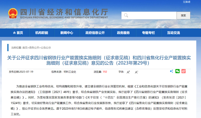 四川省經濟和信息化廳近日就《四川省鋼鐵行業產能置換實施細則(征求意見稿)》和《四川省焦化行業產能置換實施細則(征求意見稿)》公開征求意見。