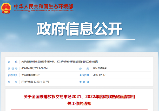 7月17日,生態環境部發布《關於全國碳排放權交易市場2021、2022年度碳排放配額清繳相關工作的通知》(以下簡稱《通知》)。