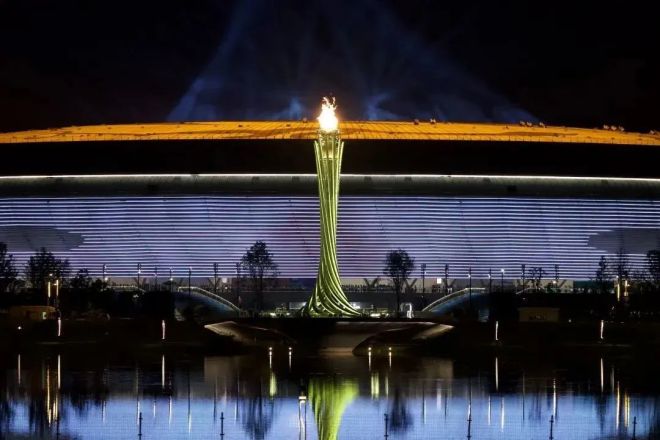 其中,位於東安湖畔的4萬座甲級體育場總建築麵積約為12萬平方米,建築高度約為50米,是一個全球少見的正圓形體育場,遠遠看去,就像一個即將起航的銀色飛碟,未來感、科技感十足。“飛碟”主體結構由混凝土結構和屋蓋鋼結構組成,鋼結構用鋼量約為1.4萬噸,相當於兩座埃菲爾鐵塔的用鋼量。