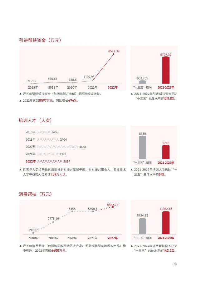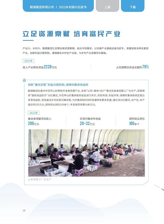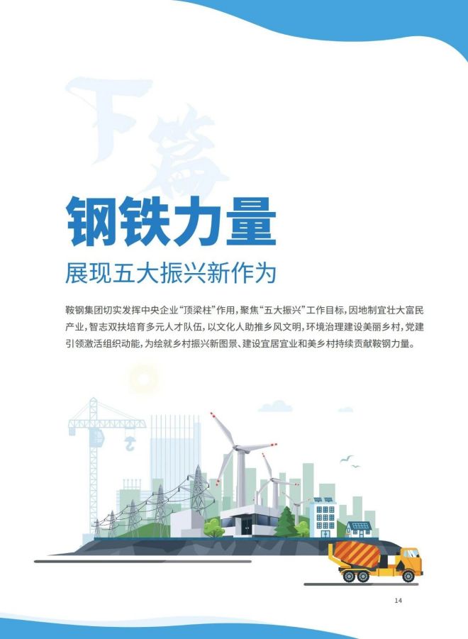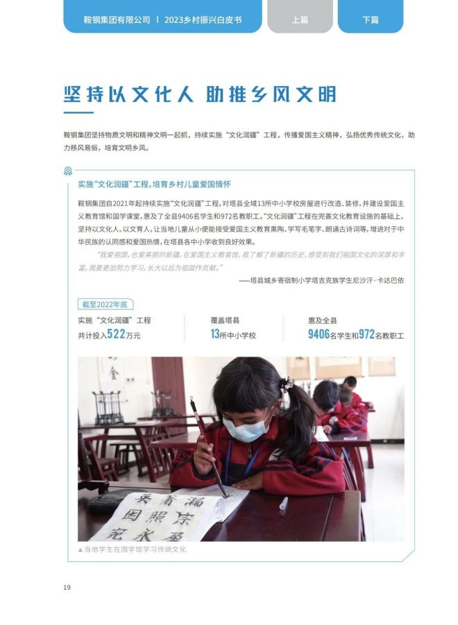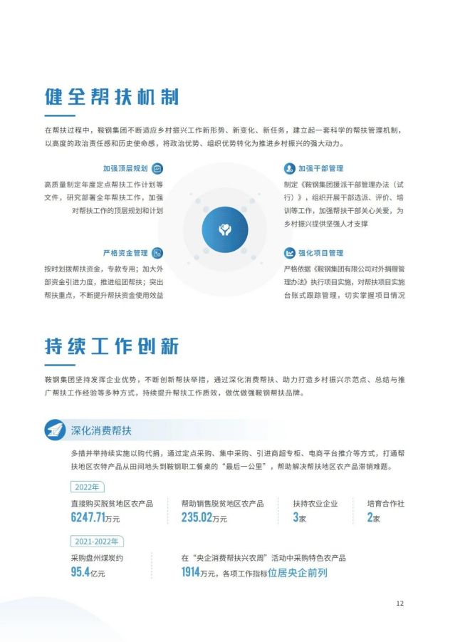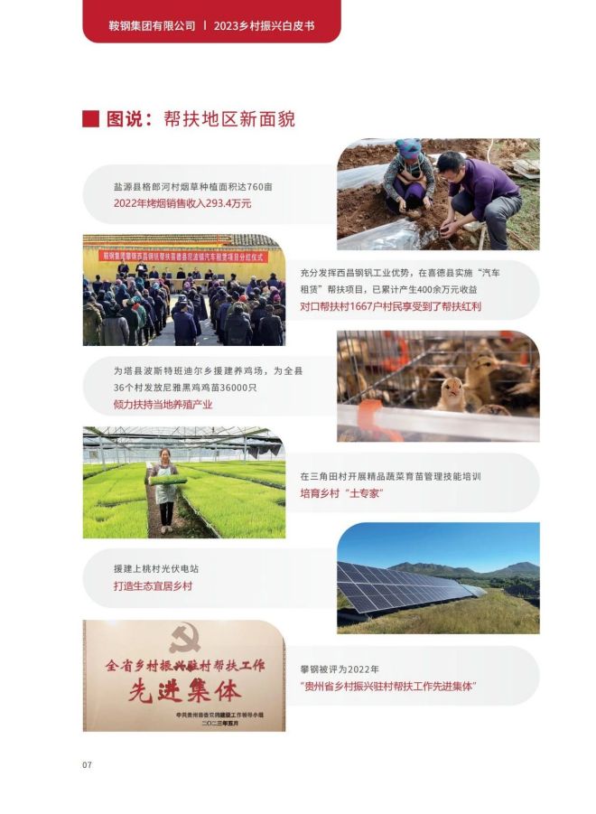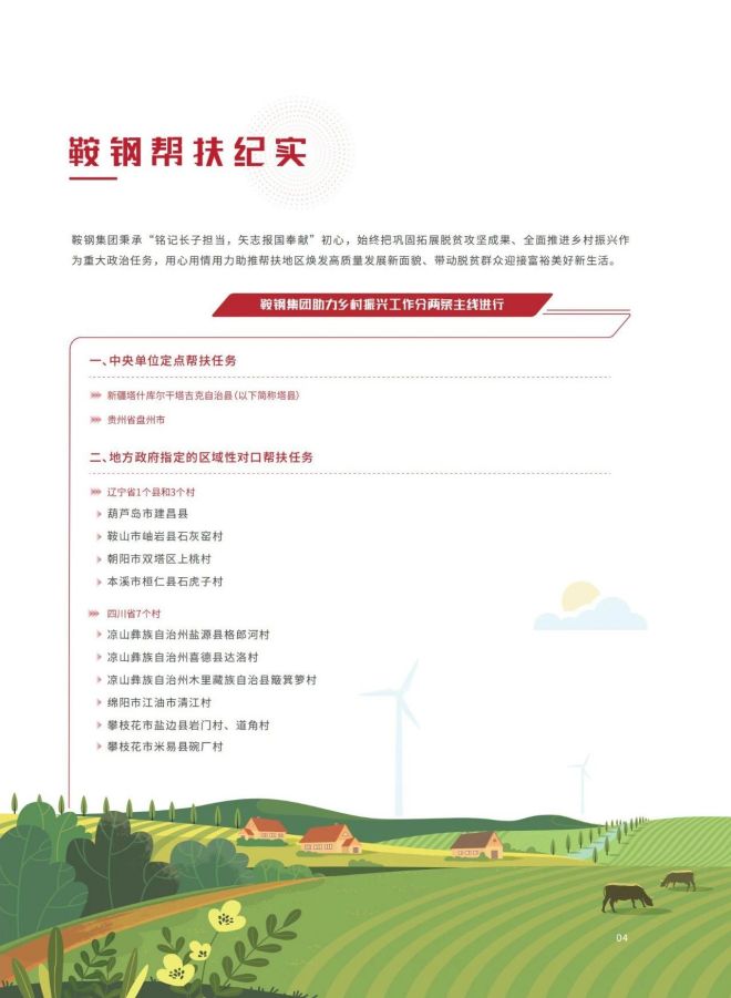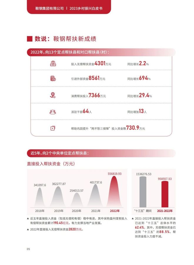 近日,《2023鞍鋼集團有限公司鄉村振興白皮書》發布,聚焦鞍鋼集團嚴格落實“四個不摘”要求,保持接續幫扶政策總體穩定、幫扶資金不減、幫扶幹部派駐力度不減、幫扶重點突出,圍繞產業、人才、文化、生態、組織全麵助力鄉村振興,持續鞏固拓展脫貧攻堅成果,做好“兩不愁三保障”重點工作,進一步深化消費幫扶。白皮書以數說、圖說、眾說的等方式生動形象地展現了鞍鋼集團幫扶工作取得的突出成績。讓我們一起翻開白皮書,了解鞍鋼集團助力鄉村振興工作成效——