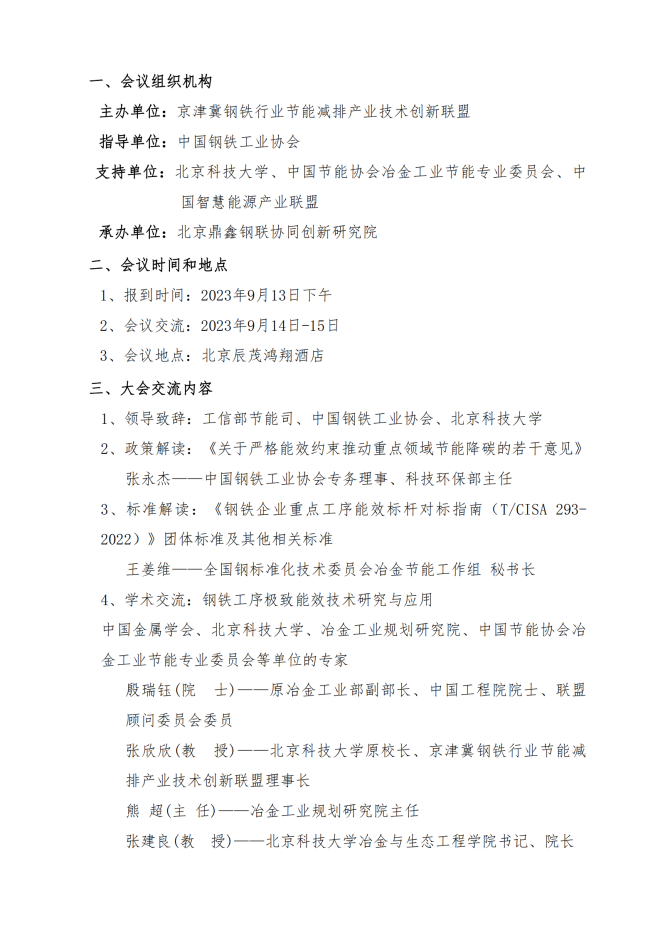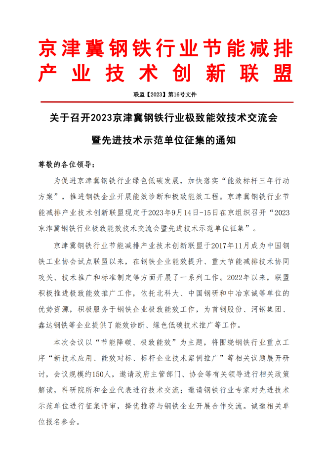 關於召開2023京津冀鋼鐵行業極致能效技術交流會 暨先進技術示範單位征集的通知