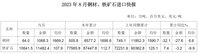 根據海關統計快訊數據,2023年8月,我國進口鋼材64.0萬噸,環比減少3.8萬噸,降幅5.6%;均價1669.2美元/噸,環比上漲67.0美元/噸,漲幅4.2%。1-8月累計進口鋼材505.8萬噸,同比減少239.3萬噸,降幅32.1%。