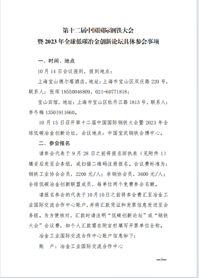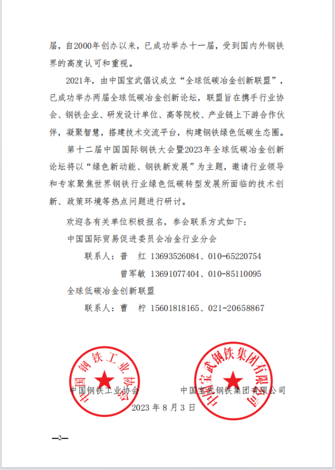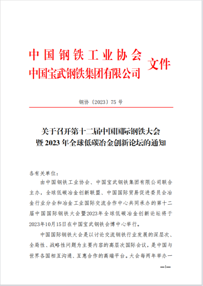 關於召開第十二屆中國國際鋼鐵大會暨2023年全球低碳冶金創新論壇的通知