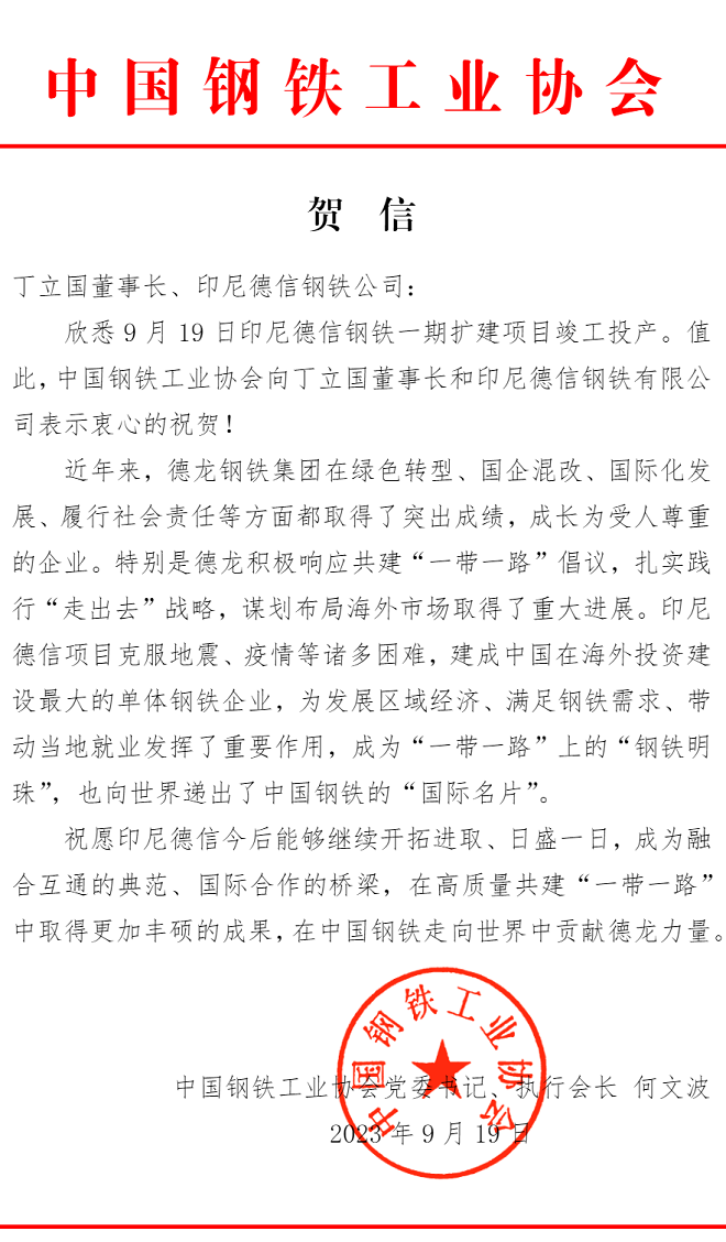 9月19日,印尼德信鋼鐵一期擴建項目竣工投產。中國鋼鐵工業協會第一時間發去賀信表示祝賀,祝願印尼德信今後能夠繼續開拓進取、日盛一日,成為融合互通的典範、國際合作的橋梁,在高質量共建“一帶一路”中取得更加豐碩的成果,在中國鋼鐵走向世界中貢獻德龍力量。