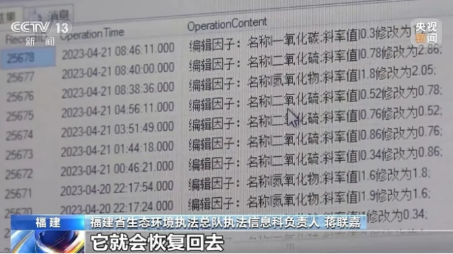 福建省生態環境執法總隊執法信息科負責人 蔣聯嘉:4月20日16點56分37秒,它把二氧化硫的斜率值,從2.86修改為1,那就是說,測出來原來是286毫克每立方米,那它因為這個斜率值被修改後,顯示出來就變成100,濃度值降低很多了。最後一條修改日誌,它把0.78修改成2.86,就是為了防止被發現,它會恢複回去。