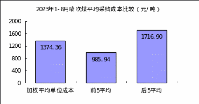 1—8月對標企業噴吹煤平均采購成本最低的前5家企業折算成幹基的加權平均采購成本為985.94元/噸,比對標企業平均采購成本低388.43元/噸,低於平均采購成本28.26%;而采購成本最高的5家企業的加權平均采購成本為1716.90元/噸,比對標企業平均采購成本高342.53元/噸,高於平均采購成本24.92%。