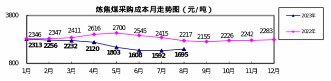 2023年8月“對標挖潛”企業焦煤、冶金焦采購成本環比升幅較大
