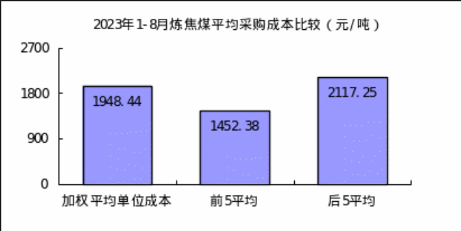 1—8月對標企業煉焦煤平均采購成本最低的前5家企業折算成幹基的加權平均采購成本為1452.38元/噸,比對標企業平均采購成本低496.06元/噸,低於平均采購成本25.46%;而采購成本最高的5家企業的加權平均采購成本為2117.25元/噸,比對標企業平均采購成本高168.81元/噸,高於平均采購成本8.66%。